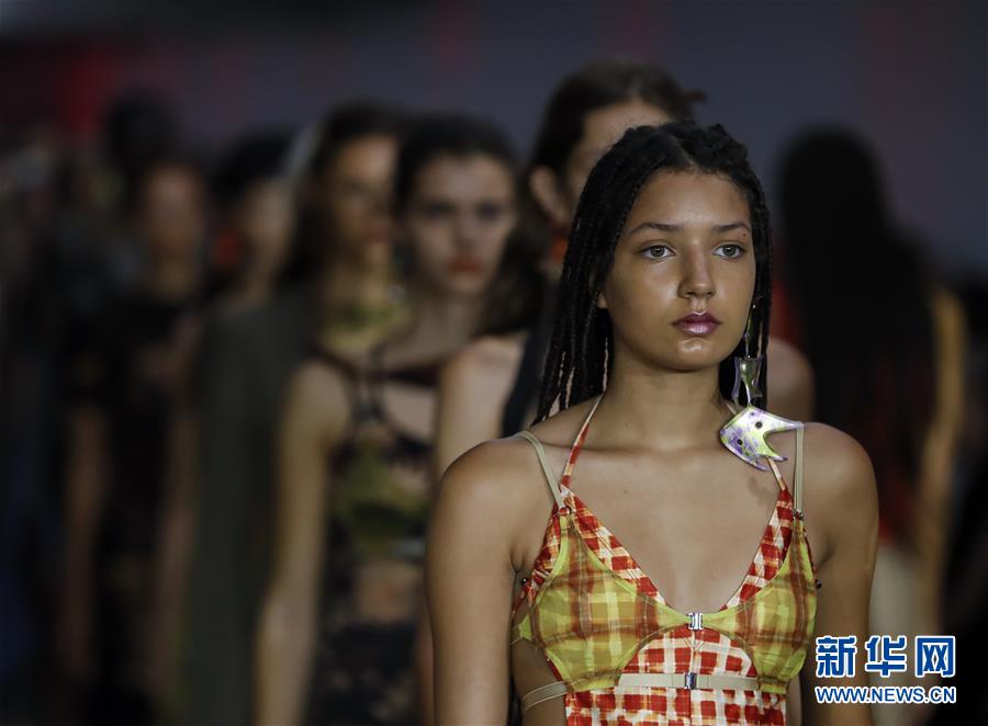 9月17日,在英國倫敦,模特在2020倫敦春夏時裝周上展示Charlotte Knowles品牌服飾。 新華社記者 韓巖 攝