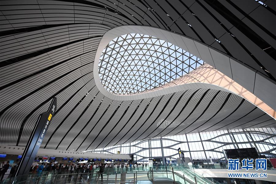 9月25日,中國(guó)南方航空公司的CZ3001次航班從北京大興國(guó)際機(jī)場(chǎng)起飛。當(dāng)日,北京大興國(guó)際機(jī)場(chǎng)正式通航。北京大興國(guó)際機(jī)場(chǎng)位于北京市大興區(qū)和河北省廊坊市廣陽(yáng)區(qū)之間,與天安門直線距離為46公里,是目前全球建設(shè)規(guī)模最大的新建機(jī)場(chǎng)。新華社記者鞠煥宗攝
