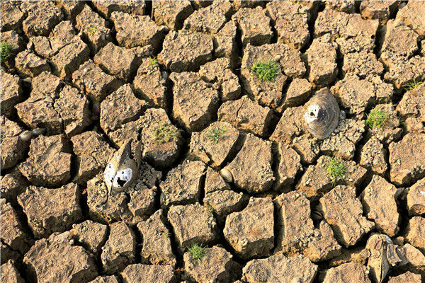 當(dāng)?shù)貢r(shí)間2016年5月13日,柬埔寨甘丹省,受厄爾尼諾現(xiàn)象影響,當(dāng)?shù)卦庥龈珊堤鞖?,池塘干涸開裂。