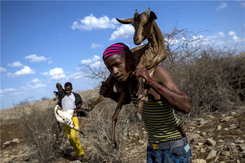 當(dāng)?shù)貢r(shí)間2016年12月15日,索馬里邦特蘭,干旱的土地上散布著羊的尸體。當(dāng)?shù)卦庥龈珊堤鞖?,牲畜受到危害?br/>