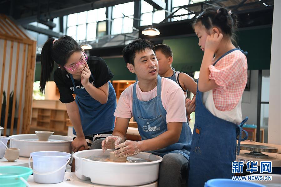 在江西景德鎮(zhèn)陶溪川文創(chuàng)街區(qū)的陶公塾實(shí)訓(xùn)基地,孩子們?cè)诶蠋煟ㄖ校┑闹笇?dǎo)下制作陶藝作品(7月26日攝)。新華社記者 萬象 攝