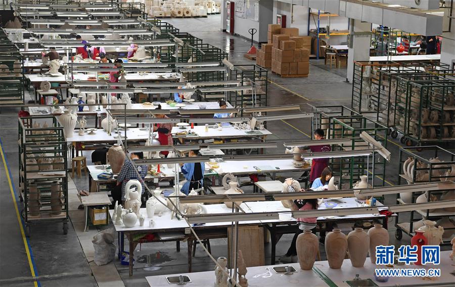 在江西景德鎮(zhèn)法藍瓷實業(yè)有限公司,工人們在陶瓷生產車間工作(2017年4月8日攝)。新華社記者 萬象 攝