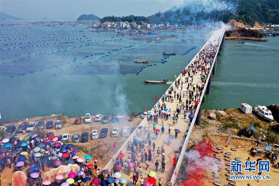 10月12日,福建省霞浦縣東安島海防大橋正式通車,這是當(dāng)?shù)厝罕娮咴谛聵蛏希o人機(jī)拍攝)。新華社記者姜克紅攝