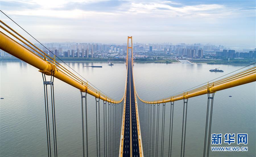 楊泗港大橋建設(shè)創(chuàng)造了多項(xiàng)世界之最:一是主橋跨度達(dá)1700米,為世界上跨度最大的雙層懸索橋;二是主橋設(shè)置雙層雙向12車道,是世界上通行能力最大的公路橋梁;三是大橋主纜設(shè)計(jì)張力6.5萬噸,采用了世界上強(qiáng)度等級最高的主纜鋼絲;四是大橋設(shè)置機(jī)動(dòng)車道、非機(jī)動(dòng)車道、人行觀光道,集過江交通與觀光于一體,是長江上功能最完備的橋梁。新華社記者熊琦攝
