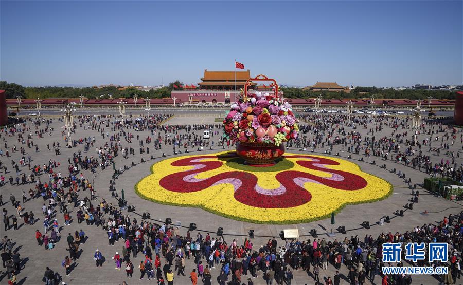 這是10月14日拍攝的天安門廣場中心花壇。 10月14日,以“花果籃”為主造型的天安門廣場中心花壇吸引了眾多游客參觀拍照。“花果籃”的夜景更是流光溢彩,絢爛迷人。 新華社記者 殷剛 攝