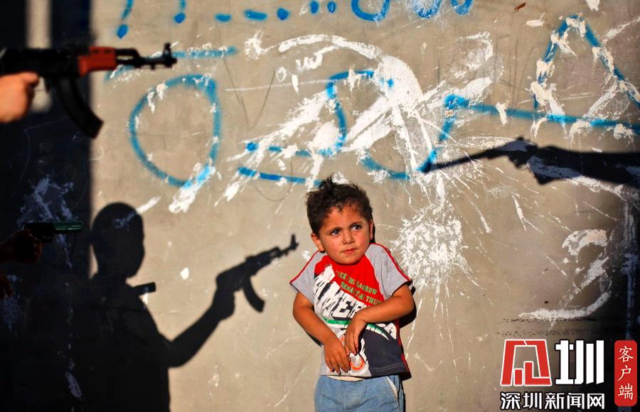當(dāng)?shù)貢r間2009年6月16日,約旦河西岸拉馬拉,Al-Amari難民營里,一個巴勒斯坦小男孩面對朝他舉著玩具槍的少年露出驚恐的表情。