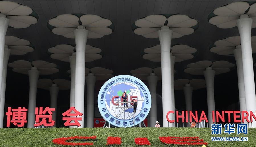 10月25日,施工人員在國展中心(上海)南廣場安裝進博會標(biāo)志。 新華社記者 方喆攝