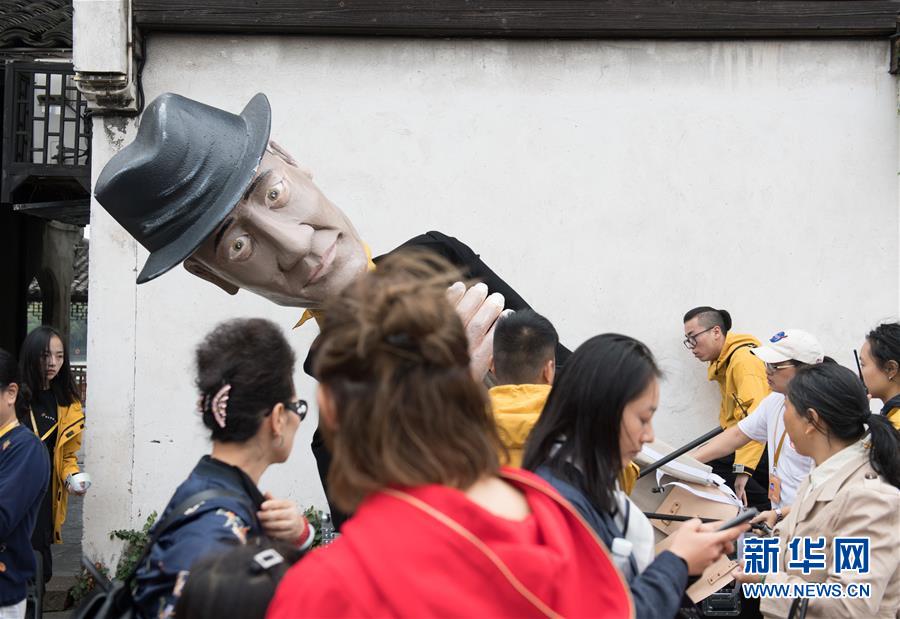 10月26日,游客經(jīng)過一個(gè)正在豎起的戲劇人偶。 新華社記者翁忻旸攝