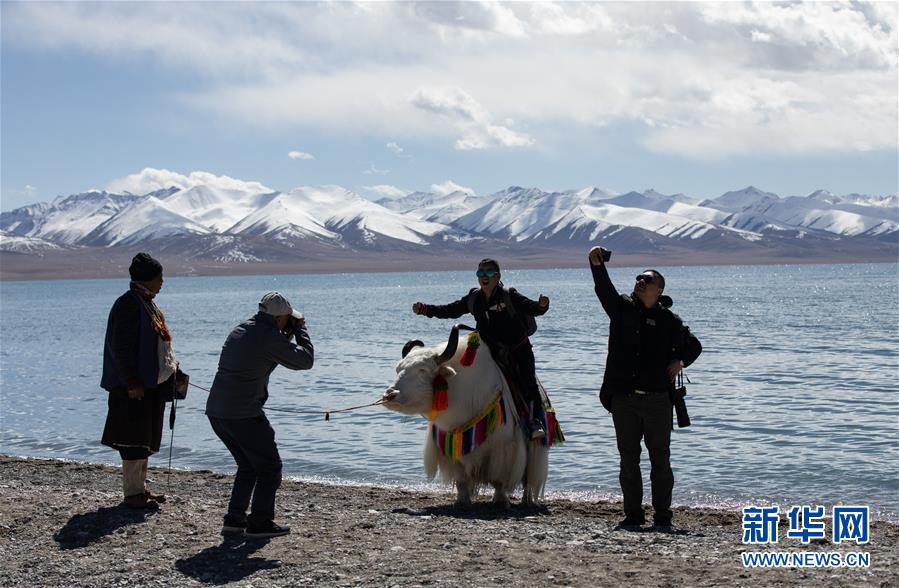 游人在西藏納木錯(cuò)湖邊留影(10月28日攝)。新華社記者江宏景攝
