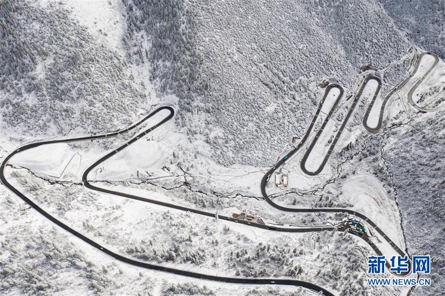 這是318國(guó)道剪子彎山段,大雪過后銀裝素裹(10月17日無(wú)人機(jī)拍攝)。新華社記者江宏景攝