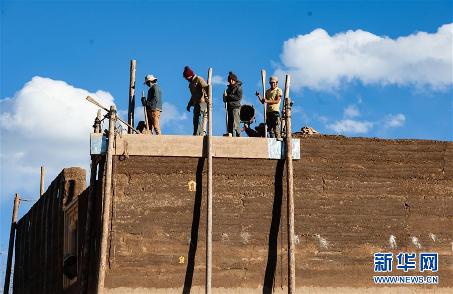 在317國(guó)道邊的四川甘孜縣呷拉鄉(xiāng),藏族群眾在修建傳統(tǒng)民居(11月3日攝)。新華社記者江宏景攝