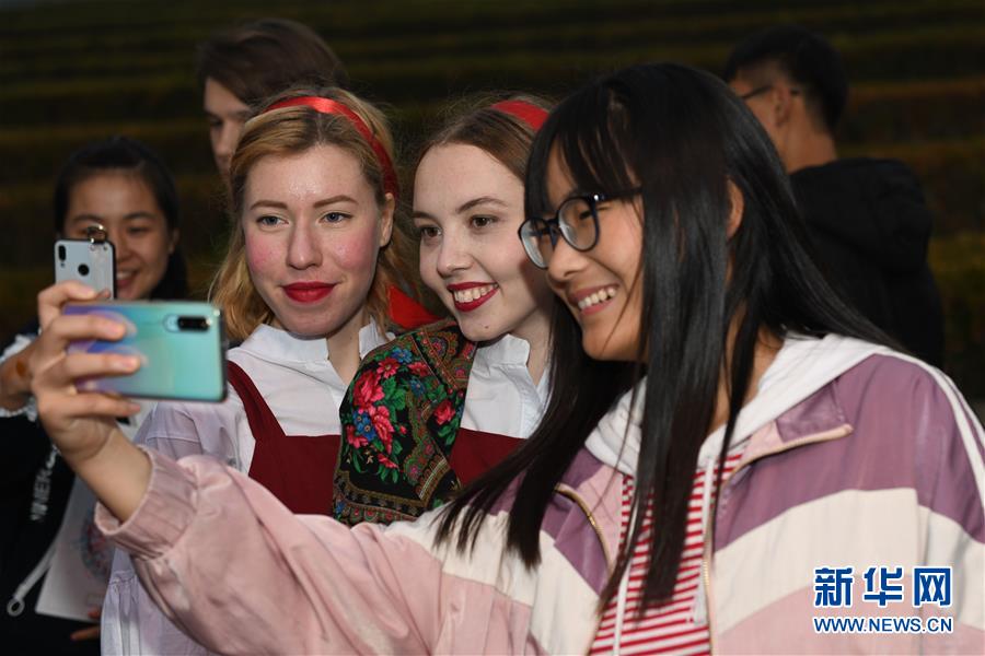 11月17日,來自俄羅斯的留學(xué)生在國際文化節(jié)上與觀眾合影。新華社記者 張端 攝