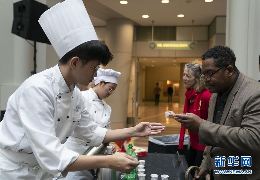 11月22日,在美國華盛頓,人們在“北京日”文化廟會活動上品嘗中國小吃。作為中國北京和美國首都華盛頓締結(jié)友好城市35周年慶祝活動的一部分,“北京日”文化廟會22日在華盛頓羅納德·里根大廈和國際貿(mào)易中心舉行。新華社記者劉杰攝