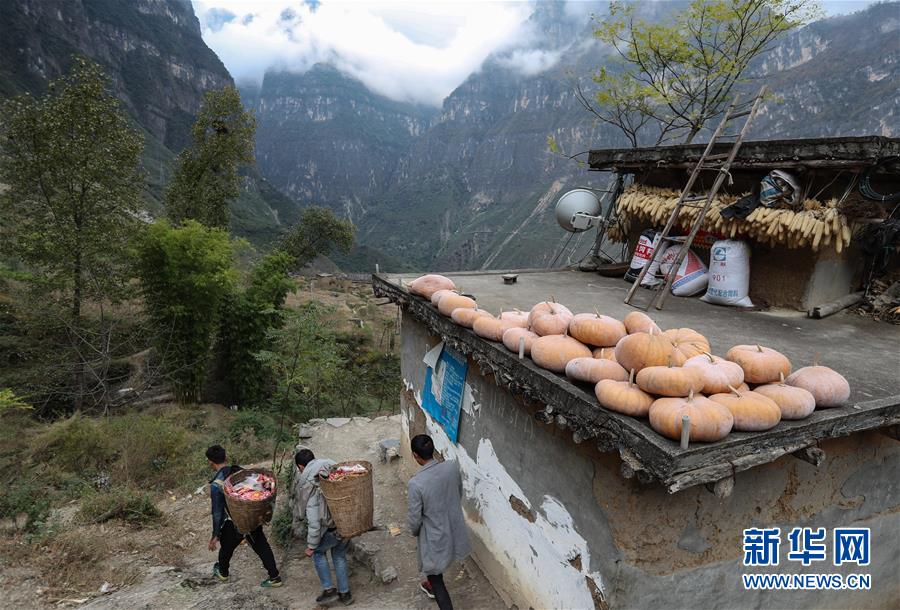 11月24日,在昭覺縣支爾莫鄉(xiāng)阿土列爾村,莫色拉博(左)、莫色蘇布惹(中)背著豬肉等禮品到親戚家拜年。新華社記者江宏景攝