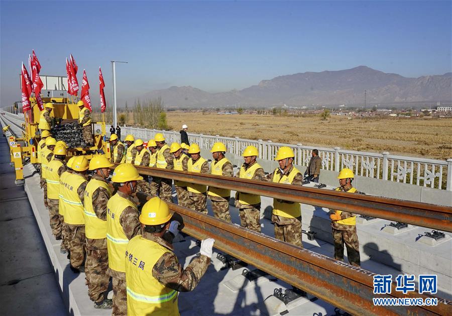 11月1日,在京張高鐵河北懷來段鋪軌現(xiàn)場(chǎng),中鐵三局的工人正在鋪設(shè)京張高鐵全線第一節(jié)軌排。