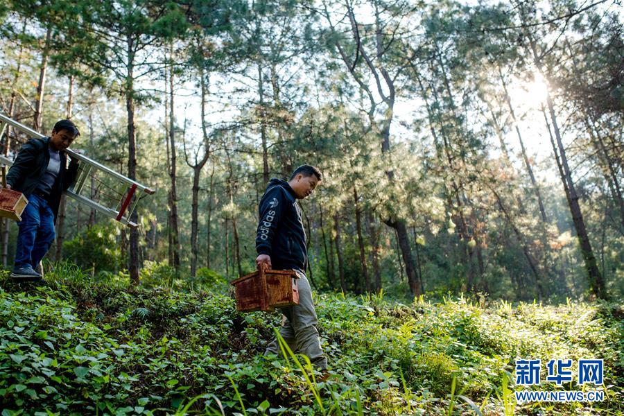 羅康(右)和同事準備在哀牢山的松樹林里安裝人工鳥巢(12月12日攝)。 新華社記者 胡超 攝