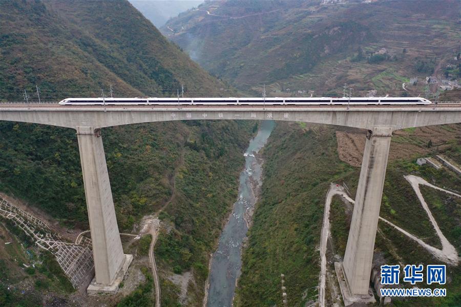 12月2日,一輛試驗(yàn)列車駛過成貴高鐵鴨池河特大橋。新華社記者劉續(xù)攝