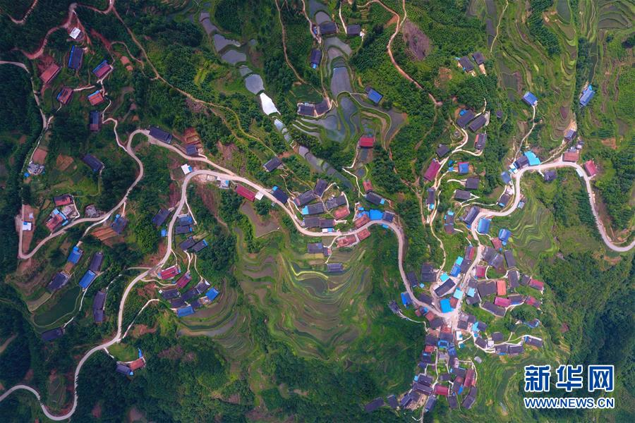 在融水苗族自治縣桿洞鄉(xiāng)黨鳩村下黨鳩屯,道路已經(jīng)修到家家戶(hù)戶(hù)門(mén)前(6月21日無(wú)人機(jī)拍攝)。新華社記者黃孝邦攝