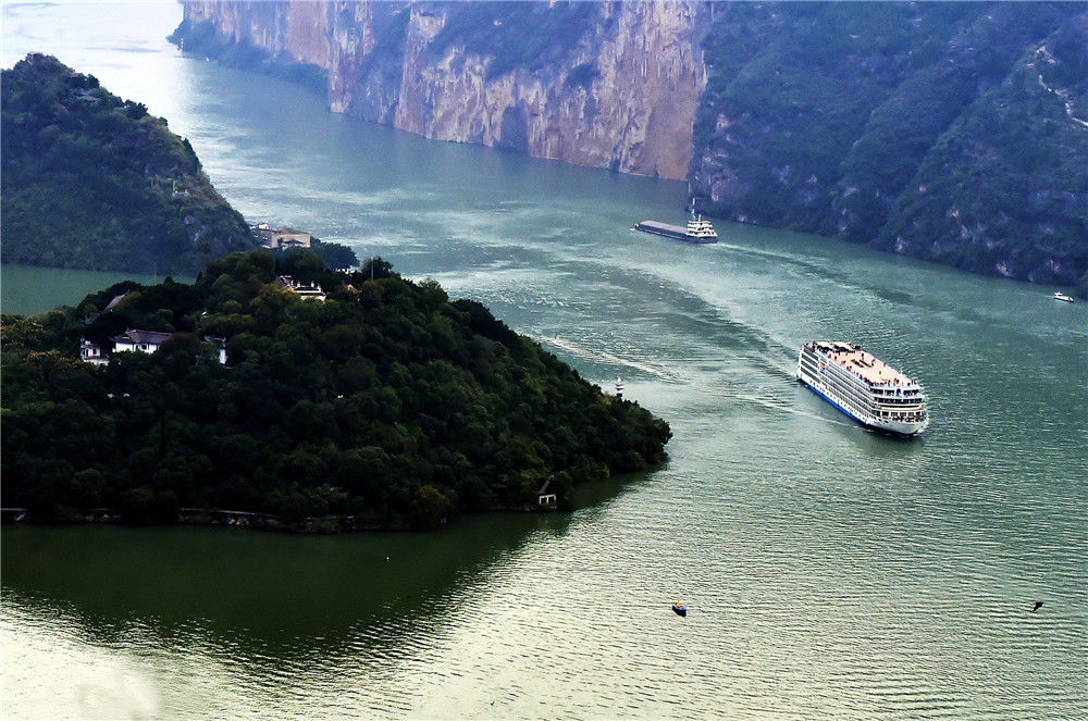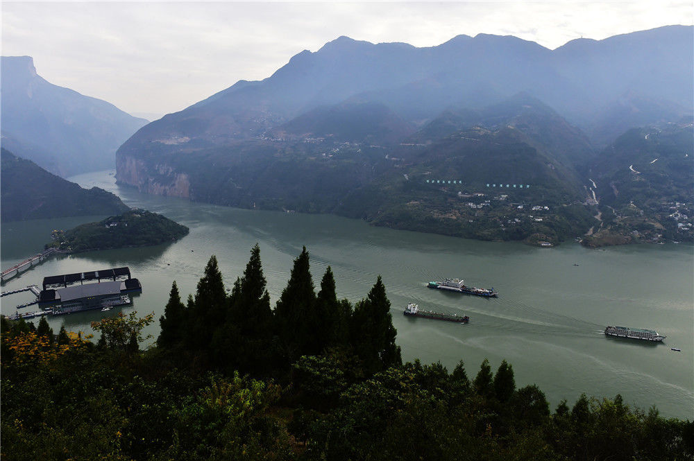 2019年11月3日,重慶,各種上行船舶正在通過白帝城前方的三峽夔門,蓄水后貨暢其流、往來無阻的水運(yùn)業(yè)彰顯“黃金水道”的社會(huì)效益。