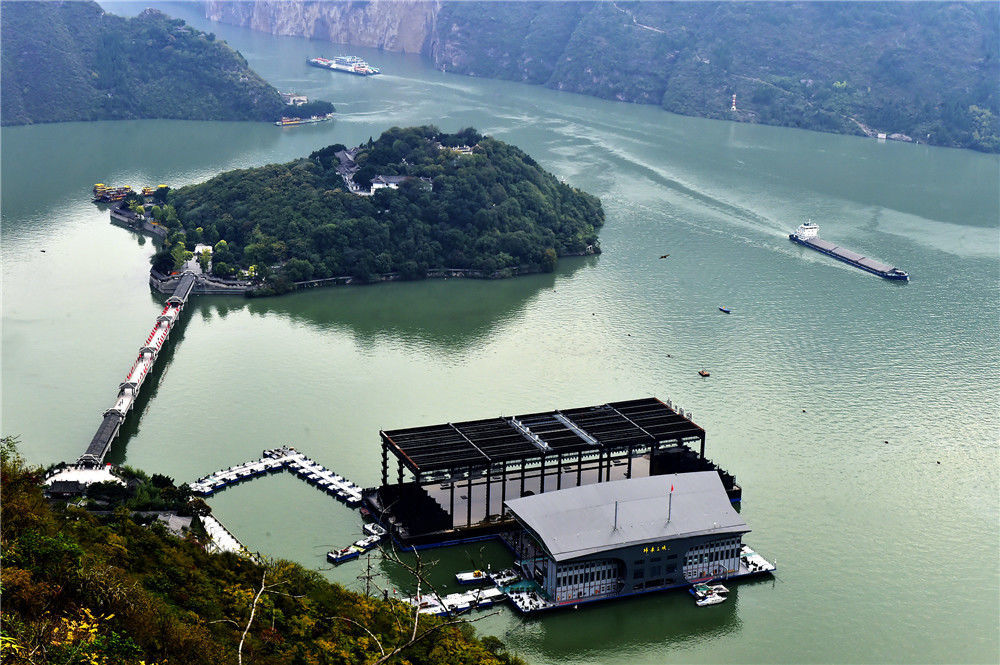 2019年11月3日,重慶,四面環(huán)水的“白帝城孤島”風(fēng)貌,各種豪華游輪陸續(xù)駛往寶塔坪旅游碼頭,供游客們登島參觀。