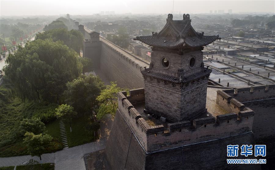這是7月20日無人機(jī)拍攝的平遙城墻上的角樓。