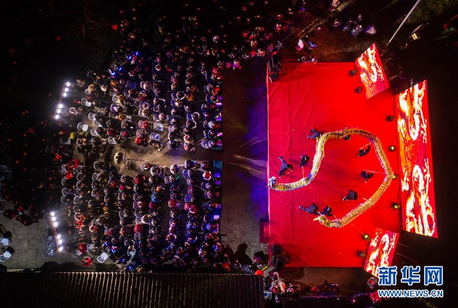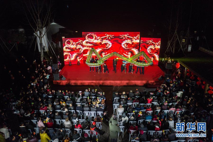 1月14日,杭州市余杭區(qū)中泰街道中橋村的文化公園內(nèi)在進(jìn)行“我們的村晚”舞龍表演,吸引了大批當(dāng)?shù)匕傩沼^看(無人機(jī)照片)。臨近春節(jié),浙江省杭州市余杭區(qū)中泰街道各村社的文化禮堂紛紛上演“我們的村晚”。老百姓自編、自導(dǎo)、自演為主的“土味”聯(lián)歡會因接地氣、親情濃而深受當(dāng)?shù)匕傩盏南矏?,成為?dāng)?shù)剜l(xiāng)村百姓的新年迎春“文化大餐”。近年來,中泰街道以文化振興助推鄉(xiāng)村振興。目前,中泰街道下屬各村陸續(xù)建成文化禮堂7個、社區(qū)文化家園2個,努力培育和挖掘出一批鄉(xiāng)土文化人才及原創(chuàng)作品,2019年全年開展各類鄉(xiāng)村社區(qū)惠民文體活動累計(jì)180余場次。新華社記者徐昱攝
