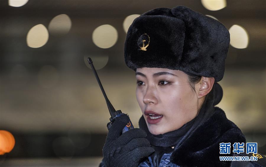 吉如在西安北站站臺上,與檢票口客運人員聯控(1月14日攝)。今年春運列車開行密度大,站臺崗位人員緊張,吉如時常被調到站臺進行站臺服務工作。 新華社記者 陶明 攝