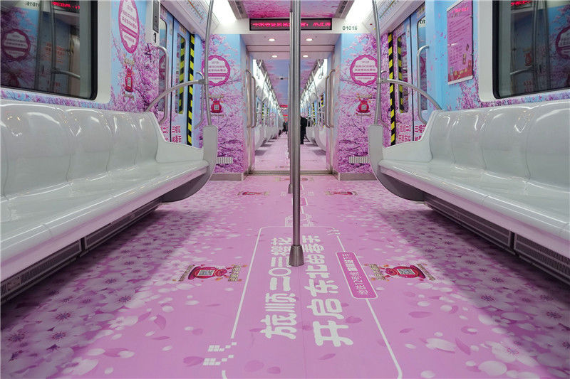 2018年4月3日,遼寧大連,伴隨濃濃春意,大連地鐵1號線、2號線、3號線、12號線櫻花專列同步上線,其中1號線為全景包列。櫻花專列車廂以粉色櫻花為基調(diào),沿枝椏延伸出的片片云霞,呈現(xiàn)春日花開意境,傳遞出北國之春的韻律。南宮傲青/視覺中國