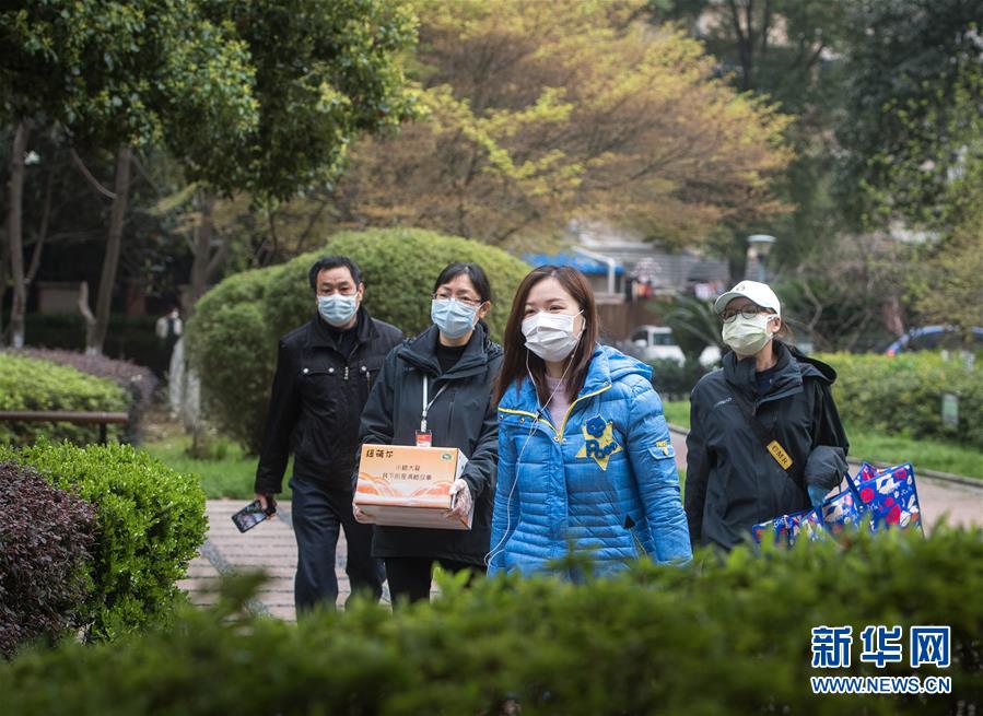 3月12日,小區(qū)樹(shù)葉綠了,黎婧(右二)與網(wǎng)格員走在回家路上。 3月12日,插畫(huà)師黎婧和84位病友離開(kāi)自己居住的武漢軟件工程職業(yè)學(xué)院康復(fù)驛站,回到自己家中。他們都是治愈出院的新冠病毒肺炎患者,已經(jīng)在武漢軟件工程職業(yè)學(xué)院康復(fù)驛站進(jìn)行了14天醫(yī)學(xué)觀察,達(dá)到醫(yī)學(xué)標(biāo)準(zhǔn),成功解除隔離。他們由專車(chē)運(yùn)送至所屬社區(qū)附近的集散點(diǎn)后,在社區(qū)工作人員的陪同下回家。 新華社記者 肖藝九 攝