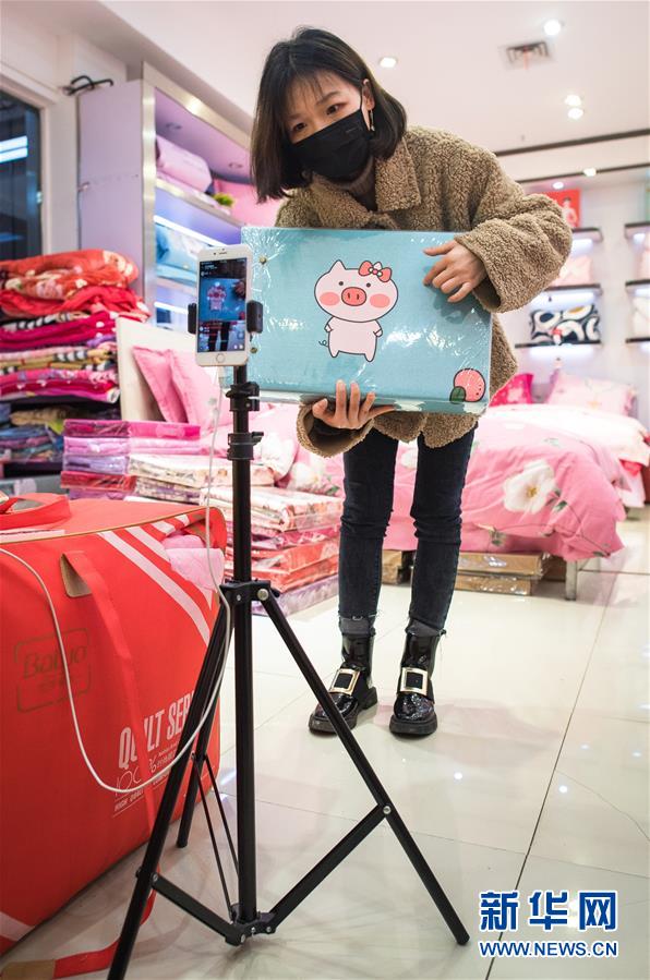 3月29日,在漢口北市場,一名主播在直播平臺(tái)直播銷售床上用品。新華社記者肖藝九攝