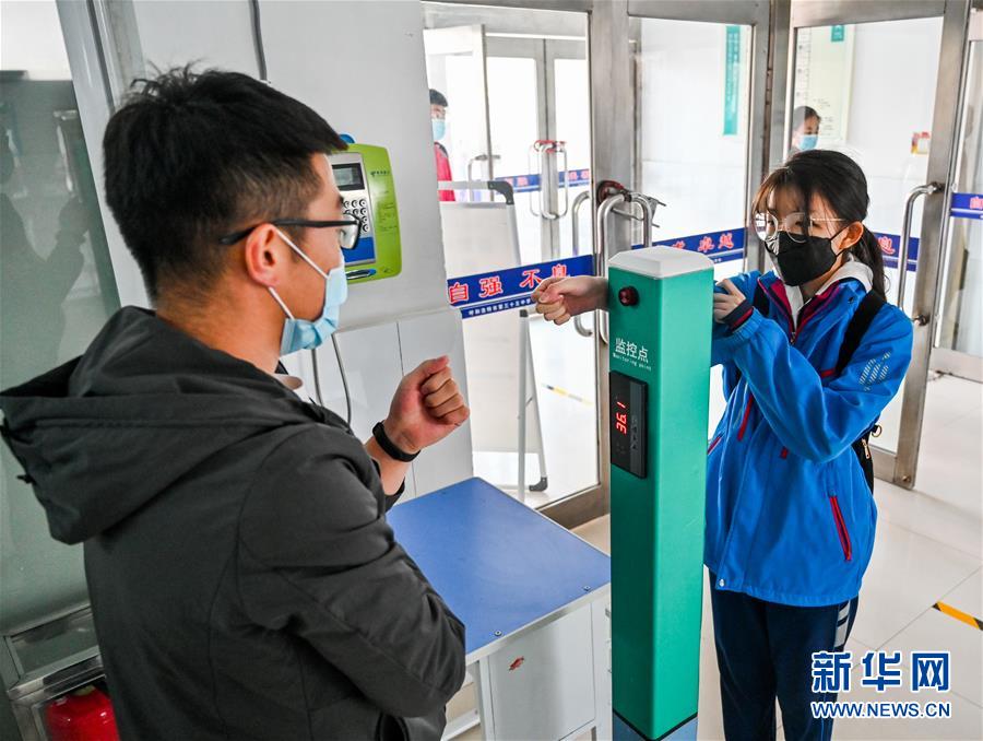 3月30日,呼和浩特市第三十五中學初三年級學生進入教學樓時測量體溫。當日,內(nèi)蒙古自治區(qū)全區(qū)高三和初三年級開學復課。新華社記者連振攝