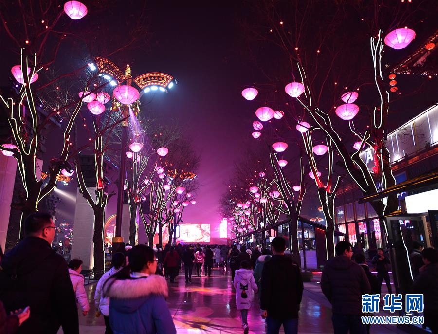 1月17日,游客在西安大唐不夜城步行街欣賞彩燈。大唐不夜城步行街位于西安市大雁塔腳下,近年來(lái),步行街突出歷史文化特色,以唐代元素為主線,創(chuàng)新打造文化濃厚的現(xiàn)代時(shí)尚街區(qū),已成為西安旅游新地標(biāo)。 新華社記者 張博文 攝
