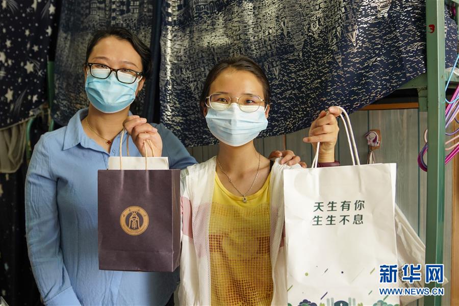 5月15日,在西南大學女生宿舍內,一名學生(右)展示學校和學院送來的裝有口罩、防疫指南的紙袋。當日,重慶西南大學迎來疫情以來首批返校大學生。據(jù)介紹,按照疫情防控的需要,重慶市高校2020年春季學期從5月11日起按照“一校一策”原則,實行錯峰錯時分批次有序開學復課。新華社記者劉潺攝
