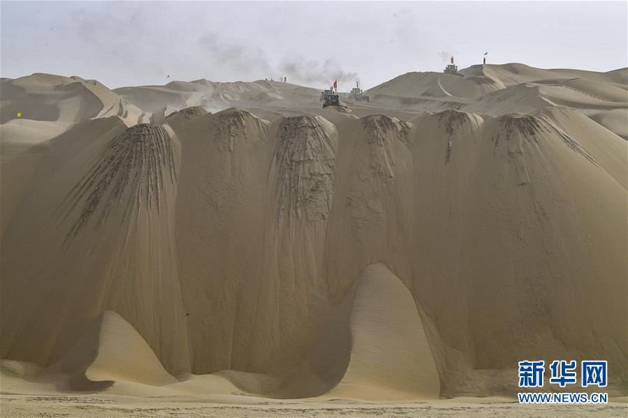 在新疆尉犁至且末沙漠公路施工現(xiàn)場(chǎng),工人駕駛大型推土機(jī)推平沙山(5月17日攝)。新華社記者胡虎虎攝