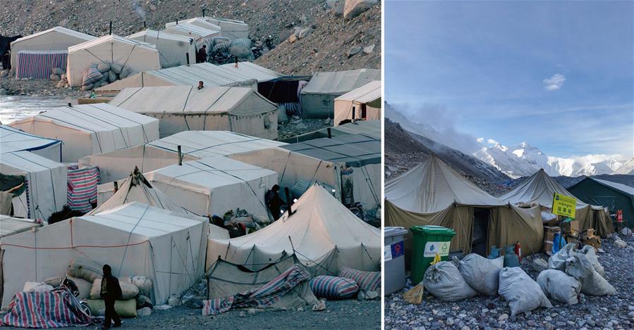 拼版照片:左圖為2005年的春季登山季,為測量、登山和科考等隊伍提供服務保障的當?shù)厝罕娫谥榉宕蟊緺I搭起的帳篷(資料照片)。新華社記者索朗羅布攝右圖為2020珠峰高程測量活動中,曾經(jīng)被視為登山隊最好的帳篷變成了垃圾集中存放處。新華社記者普布扎西攝