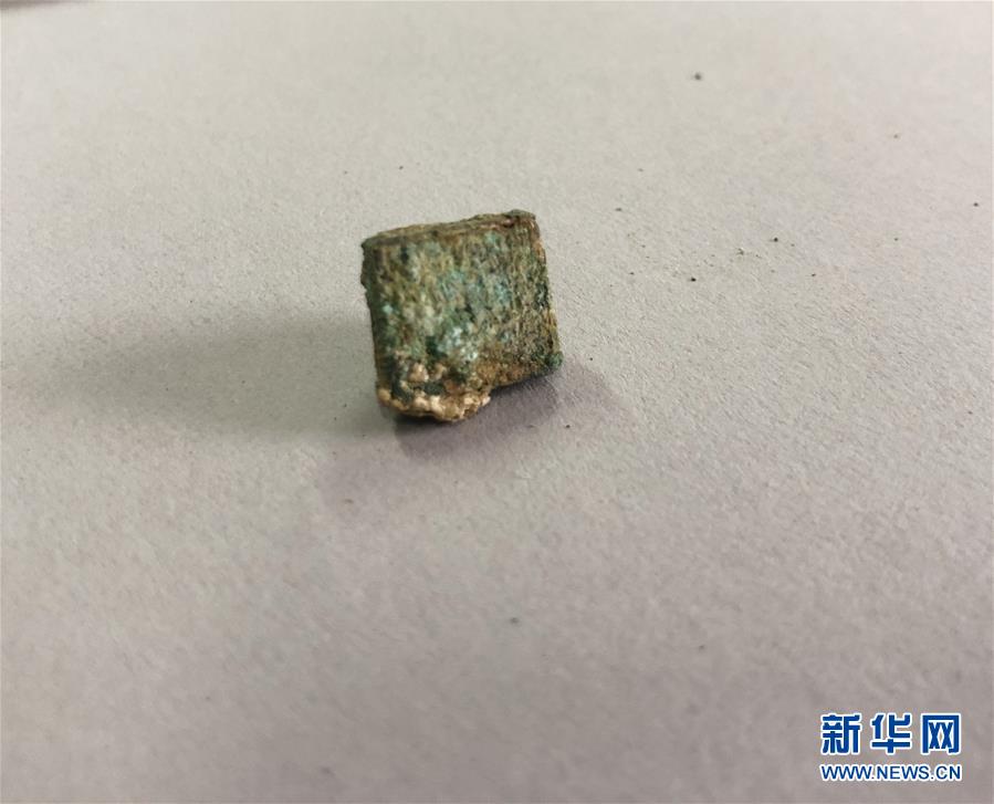 黃河邊大型古墓群出土的一組青銅材質的筆帽(5月22日攝)。新華社記者李麗靜攝