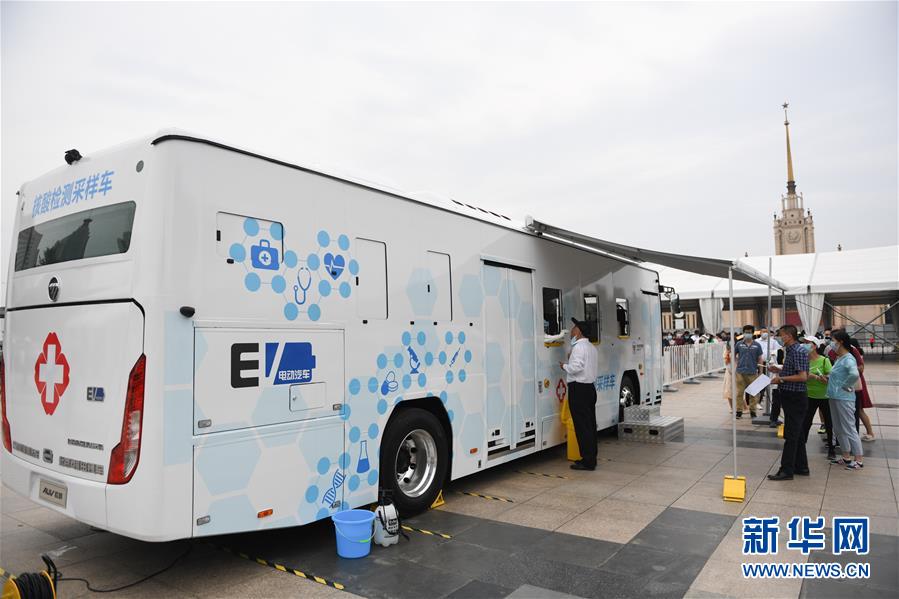 6月28日,在北京市西城區(qū)北京展覽館南側(cè)的露天廣場核酸檢測采樣點(diǎn),前來做檢測的人員在核酸檢測采樣車旁排隊(duì)。新華社記者鞠煥宗攝