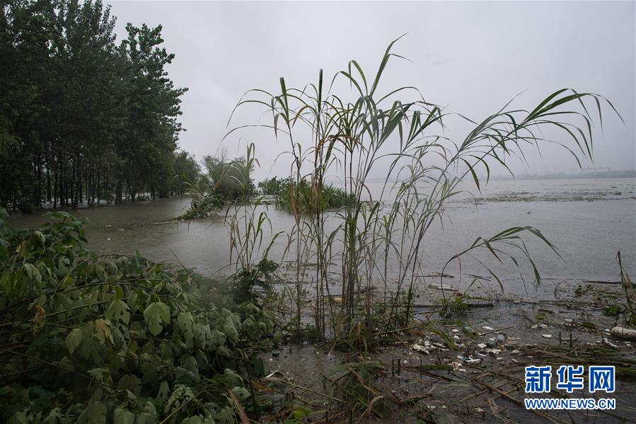 7月7日,上漲的江水淹沒(méi)武漢天興洲江邊的部分植被。新華社記者肖藝九攝