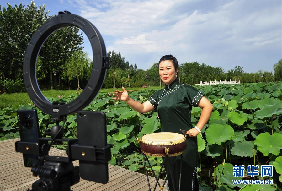 8月13日,河北省河間市西河大鼓非遺項目藝人李雪通過網絡直播表演西河大鼓。暑假期間,河北省河間市文化館推出非遺展演“云端”播系列活動,組織當地西河大鼓非遺項目傳承人利用視頻直播的方式進行線上展演,通過“云端”傳承非遺文化。新華社記者朱旭東攝