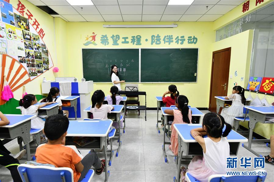 8月13日,在貴州省思南縣雙塘街道麗景社區(qū)易地扶貧搬遷安置點,志愿者在給孩子們上音樂課。今年暑假期間,在貴州省銅仁市思南縣雙塘街道麗景社區(qū)易地扶貧搬遷安置點,來自北京有研集團和思南當(dāng)?shù)氐闹驹刚邆兝檬钇跁r間,給安置點的孩子們進行音樂、體育、手工、安全教育等課程輔導(dǎo),幫助搬遷戶照看孩子,讓孩子們在學(xué)習(xí)中度過一個快樂而有意義的暑假。新華社記者楊文斌攝