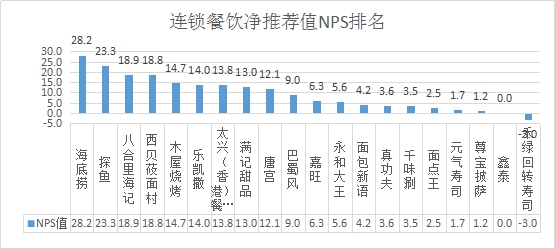 在本次調(diào)研中,20個(gè)連鎖餐飲品牌包括三類:中式正餐(海底撈、探魚(yú)、八合里海記、西貝筱面村、木屋燒烤、太興(香港)餐廳、唐宮、巴蜀風(fēng)、千味涮)、中式快餐(嘉旺、永和大王、真功夫、面點(diǎn)王)、特色餐飲(樂(lè)凱撒、滿記甜品、面包新語(yǔ)、元?dú)鈮鬯尽⒆饘毰_、鑫泰、禾綠回轉(zhuǎn)壽司)。整體的平均凈推薦值為9.4分。排名第一的是海底撈,凈推薦值為28.2分;其次是探魚(yú),凈推薦值為23.3分;第三名是八合里海記,凈推薦值為18.9分。