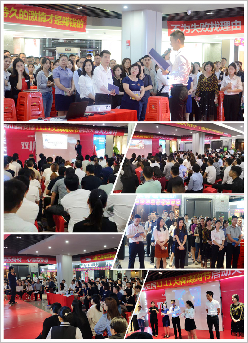 隨后,來自南山店全體方陣隊員高舉隊旗,高喊口號,將現(xiàn)場氣氛推向高潮,品牌代表們紛紛上臺發(fā)言,幾百家建材家具品牌以第一軍團、第二軍團、第三軍團、第四軍團、等等團隊方陣,登場亮相,高呼團隊口號,并且當場簽署了“雙11大促”的軍令狀,并從商場負責人手中接過了“雙11大促”的軍旗,這將預示著“國安居南山店&騰訊優(yōu)居雙11大牌嗨購節(jié)”定將以卓越的佳績,創(chuàng)造新一輪的銷售盛況!