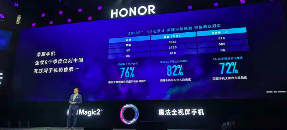 2018年,在全球智能手機(jī)市場增長遇冷的大勢下,榮耀繼續(xù)乘風(fēng)破浪的亮眼表現(xiàn)。在國內(nèi)市場,連續(xù)9個(gè)季度位列中國互聯(lián)網(wǎng)手機(jī)銷售第一,進(jìn)一步夯實(shí)互聯(lián)網(wǎng)手機(jī)第一品牌的地位。據(jù)賽諾數(shù)據(jù)顯示,2018年1-9月,榮耀手機(jī)以3966萬臺(tái)的銷量、578億元的銷售額,雙雙進(jìn)入中國手機(jī)市場的前五,這也是唯一入圍TOP5的互聯(lián)網(wǎng)手機(jī)品牌。同時(shí),榮耀在全球74個(gè)國家市場以榮耀模式縱深布局、深度耕耘,強(qiáng)勢進(jìn)入快速增長通道。
