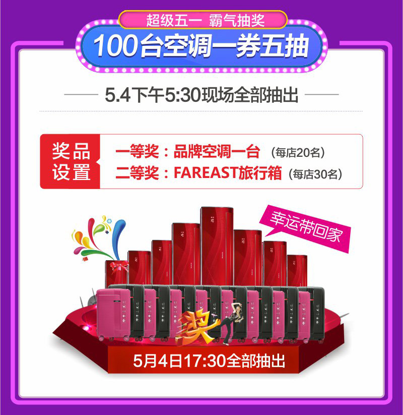 1、一券五抽,100臺空調(diào)重出江湖:4月20日-5月4日活動期間,業(yè)主下定實付金額滿1000元即可參與空調(diào)大抽獎,滿1000兌換抽獎券一張,滿2000兌換兩張,以此類推,上不封頂,一張抽獎券可前往國安居深圳五店參與100臺空調(diào)大抽獎,五次中獎機會哦!