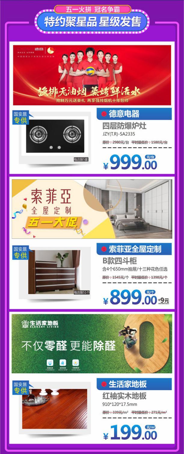 4、冠名聚星品爆款星級發(fā)售:4月20日-5月4日活動期間,國安居精選三大家居大牌火拼五一,星級巨獻!999元搶德意電器爐灶、899元搶索菲亞全屋定制四斗柜、199元搶生活家實木地板,限量爆款全城瘋搶,絕對驚爆眼球。