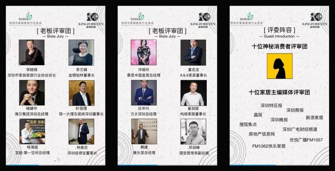 其中,由簡一大理石瓷磚、海爾卡薩帝、慕思寢具、A&X家具、方太電器、構(gòu)城定制、雅樂薈、寶能第一空間、國安居、佳得寶等家居行業(yè)知名品牌老總組成的老板評審團(tuán)特別引人注目。組委會(huì)特別介紹,這些品牌在行業(yè)的影響力有目共睹,他們的認(rèn)可是對設(shè)計(jì)能力與市場影響力不可置疑的肯定。