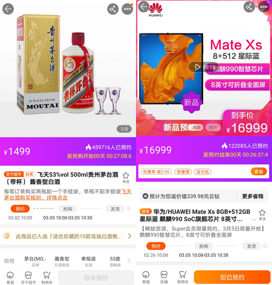 截止到開售前,蘇寧易購平臺飛天茅臺預(yù)約量將近46萬人,華為Mate Xs預(yù)約量超過12萬人,兩款高端產(chǎn)品在蘇寧易購累計預(yù)約人數(shù)達(dá)到58萬人,值得注意的是,這兩款在各自領(lǐng)域的頂尖高端產(chǎn)品,蘇寧易購SUPER會員可預(yù)約購買,8分鐘內(nèi)有58萬人瞄準(zhǔn)這兩款產(chǎn)品,并且都是一經(jīng)開售就被快速搶完,左手茅臺右手華為Mate Xs,消費熱情不減。
