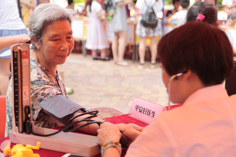 義診現(xiàn)場,居民們排隊等候醫(yī)護人員幫他們做檢查。“前兩天,看到海報上說今天的活動有義診,這不,剛帶孫子游泳回來就過來了?!本用駝⒛棠虖陌锬贸隽艘粋€裝藥品的塑料袋,告訴記者,自己高血壓,想讓醫(yī)生瞧瞧那些藥還要不要吃。