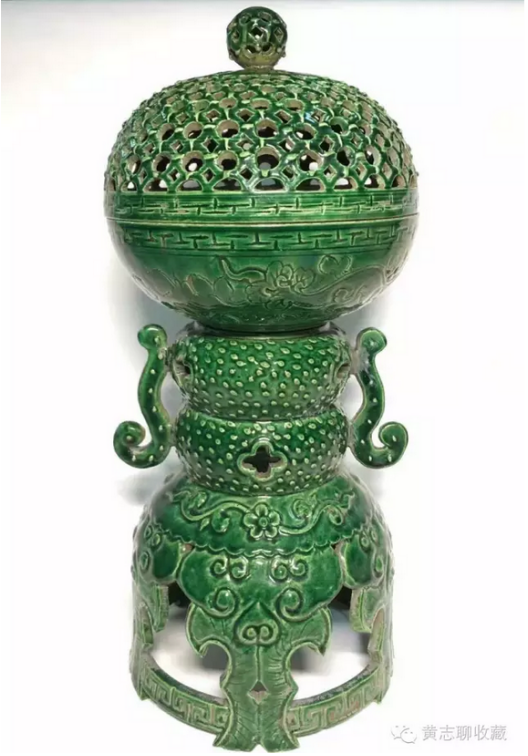 香薰在古代是頗為流行的室內(nèi)陳設(shè)用器,形制多樣,材質(zhì)不一。漢唐時期出土的香薰眾多,如有名的漢代博山爐,唐代香薰球等。兩宋時期,實行文人治國,香具更是盛行,影響所及,同時并存的遼、金兩朝也頗為風(fēng)行。當(dāng)然,香具中也區(qū)分宅舍用及寺廟用、宮殿用等。其中寺廟及宮殿用品多為成對擺放,講究對稱之美,顯得莊重大方。而宅舍之用更為推崇雅致,趣味。下面介紹的這件綠釉香薰應(yīng)為遼金時期的寺廟用品。 香薰高31.5cm、直徑14.5cm,整體呈豆式。豆是先秦禮器,用以在祭祀、宴饗中盛放肉食。在家廟祭祀中,豆是不可或缺的禮儀用具,早期豆用竹編成,后用青銅鑄造,因此在禮書中稱“籩豆”。此對香薰延續(xù)了青銅豆的大體形制,上作球形,香盤半圓,蓋為鏤空半圓,扣合后渾然如一。香盤可拆卸,安插于支座上。座上部為雙扁圓狀疊壓,兩側(cè)裝飾螭龍耳;下部呈鏤空裙擺式,承以托泥,穩(wěn)重大方。通體施綠釉,釉面潤澤,純凈自然。器身點綴穿花龍紋,如意紋,加之裙擺上的龕形開光,推測為當(dāng)時高等級的寺廟的佛前薰香供器。 欣賞更多藏品,歡迎瀏覽【黃志博物館】網(wǎng)站。 我們會介紹更多的收藏知識、推薦更多優(yōu)質(zhì)優(yōu)價的藏品供您了解和選擇,也歡迎您把這些分享給朋友們,讓大家一起來了解歷史文化、體會收藏的快樂!