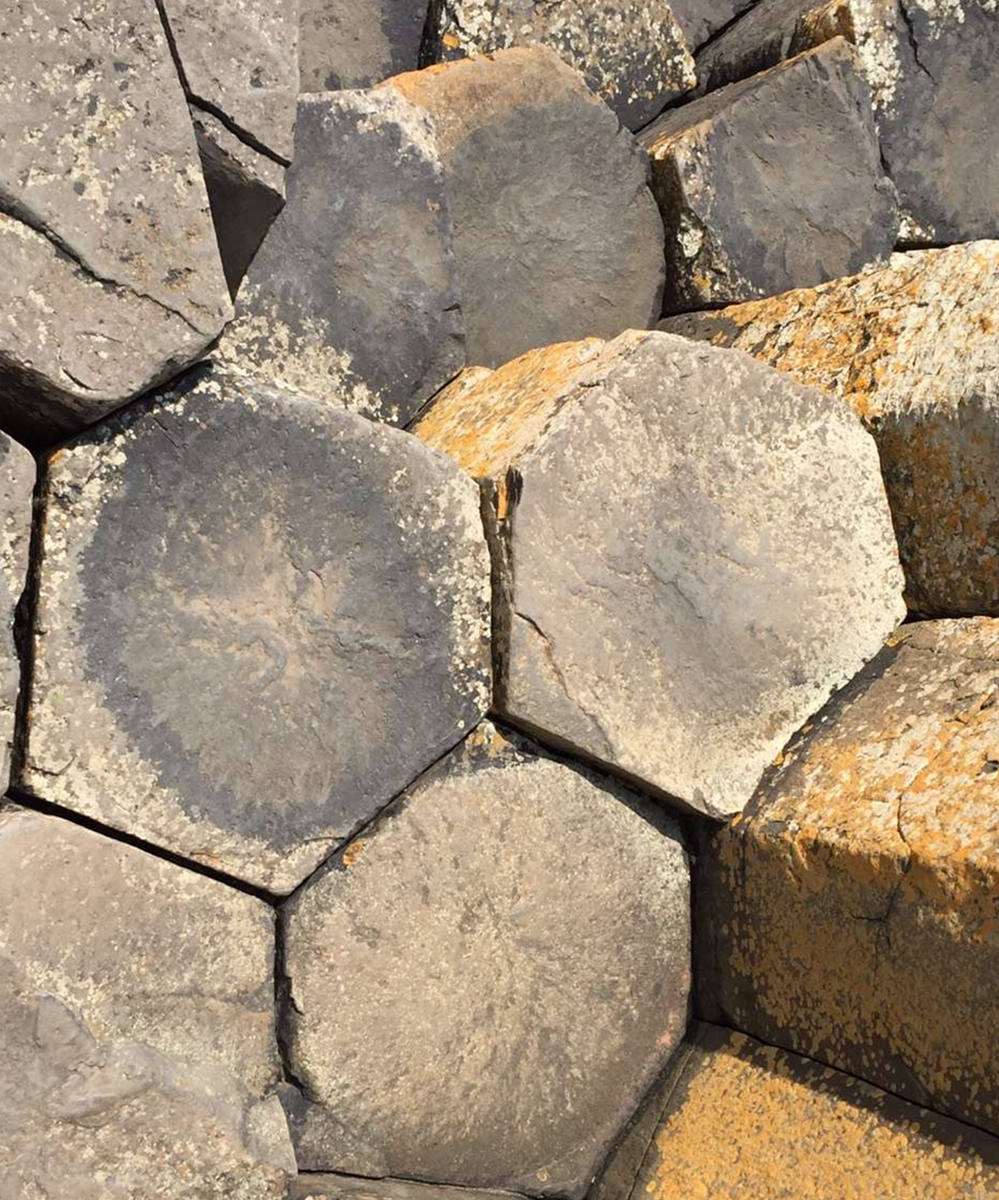 約五千萬(wàn)年前,在今天蘇格蘭西部?jī)?nèi)赫布里底群島一線(xiàn)至北愛(ài)爾蘭東部火山非?;钴S,一股股玄武巖巖熔流從裂隙的地殼中涌出,隨著灼熱的熔巖冷卻收縮,結(jié)晶的時(shí)候,開(kāi)始爆裂呈規(guī)則的六邊形形態(tài)。李仁奇 攝